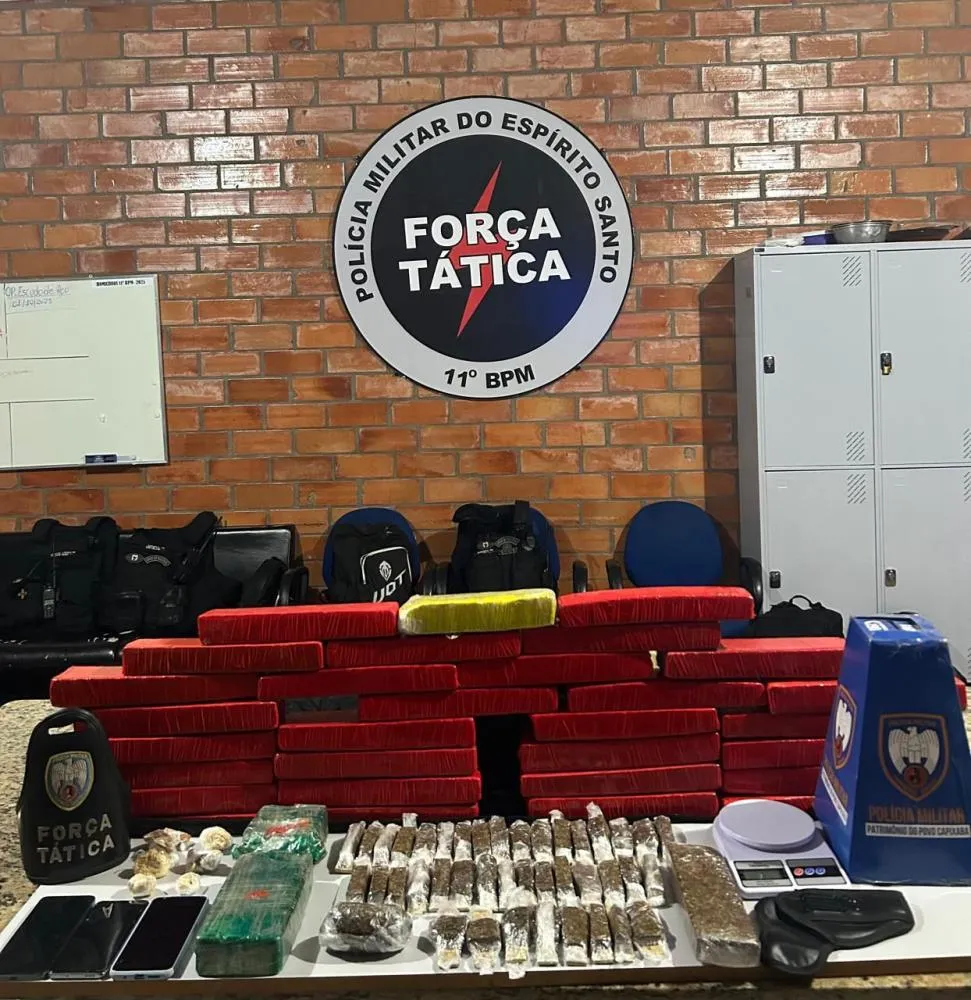 Na sequência, os militares fizeram buscas na residência. No local, foram apreendidos 30 tabletes de maconha (30,976 kg), 40 pedaços grandes de maconha embalados para venda, um tablete de crack (1,030 kg), mais de 500 gramas de crack, um coldre, três balanças de precisão e três aparelhos celulares.