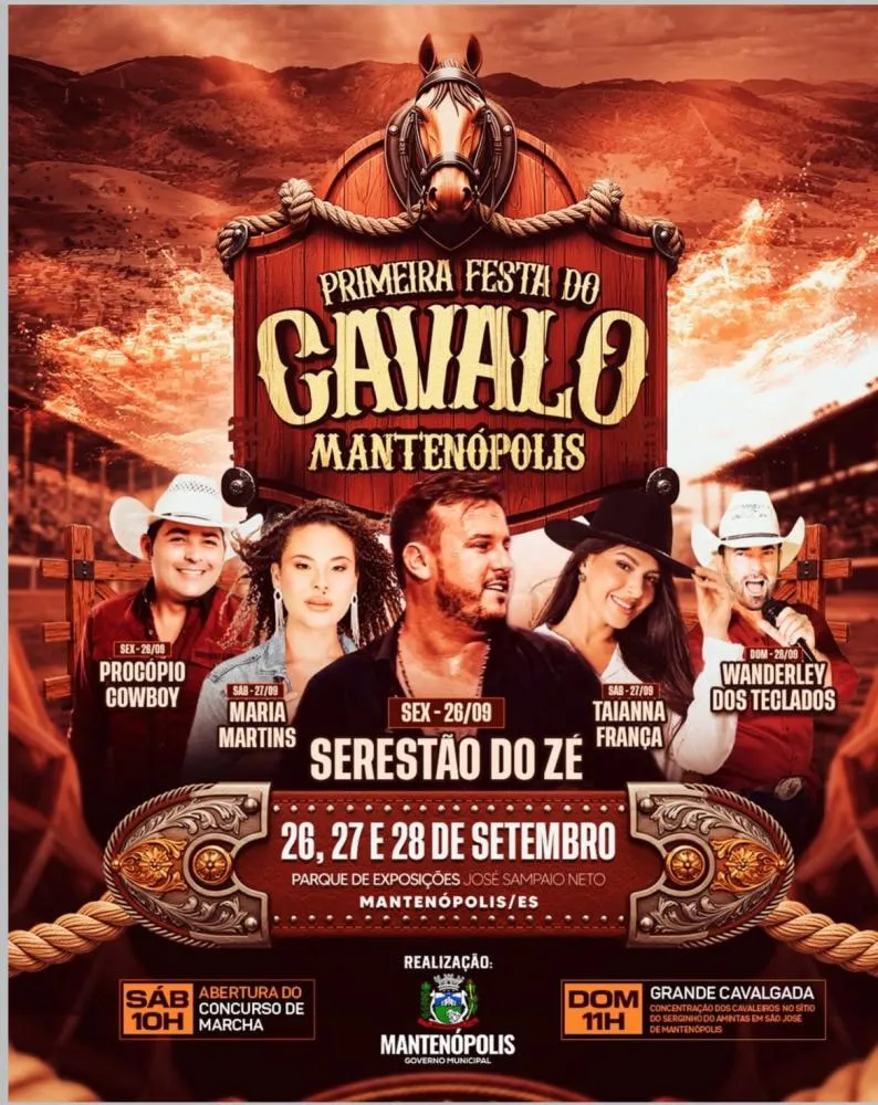 Além dos shows, o protagonista da festa, o cavalo, terá seu merecido destaque. No sábado, a partir das 10h, o público poderá acompanhar o Concurso de Marcha, um evento que valoriza a elegância e a técnica dos animais. Já no domingo, a partir das 11h, a festa se expande para as ruas com a Grande Cavalgada. A concentração será no Sítio do Serginho do Amintas, em São José de Mantenópolis, convidando cavaleiros e amazonas da região a participarem de um percurso festivo que culminará no Parque de Exposições.