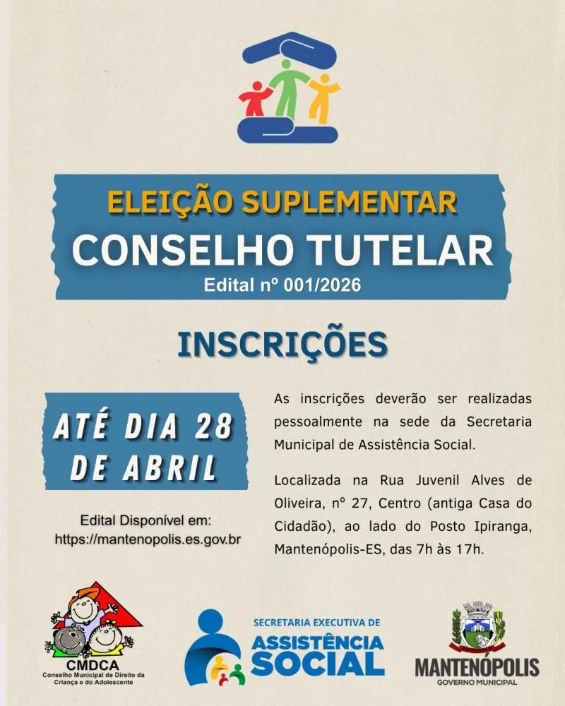 A rede de proteção à infância e juventude de Mantenópolis está com um novo processo de seleção em curso. A Secretaria Executiva de Assistência Social (SEAS), em conjunto com o Conselho Municipal de Direitos da Criança e do Adolescente (CMDCA), anunciou a abertura das inscrições para a Eleição Suplementar do Conselho Tutelar, regida pelo Edital nº 001/2026.