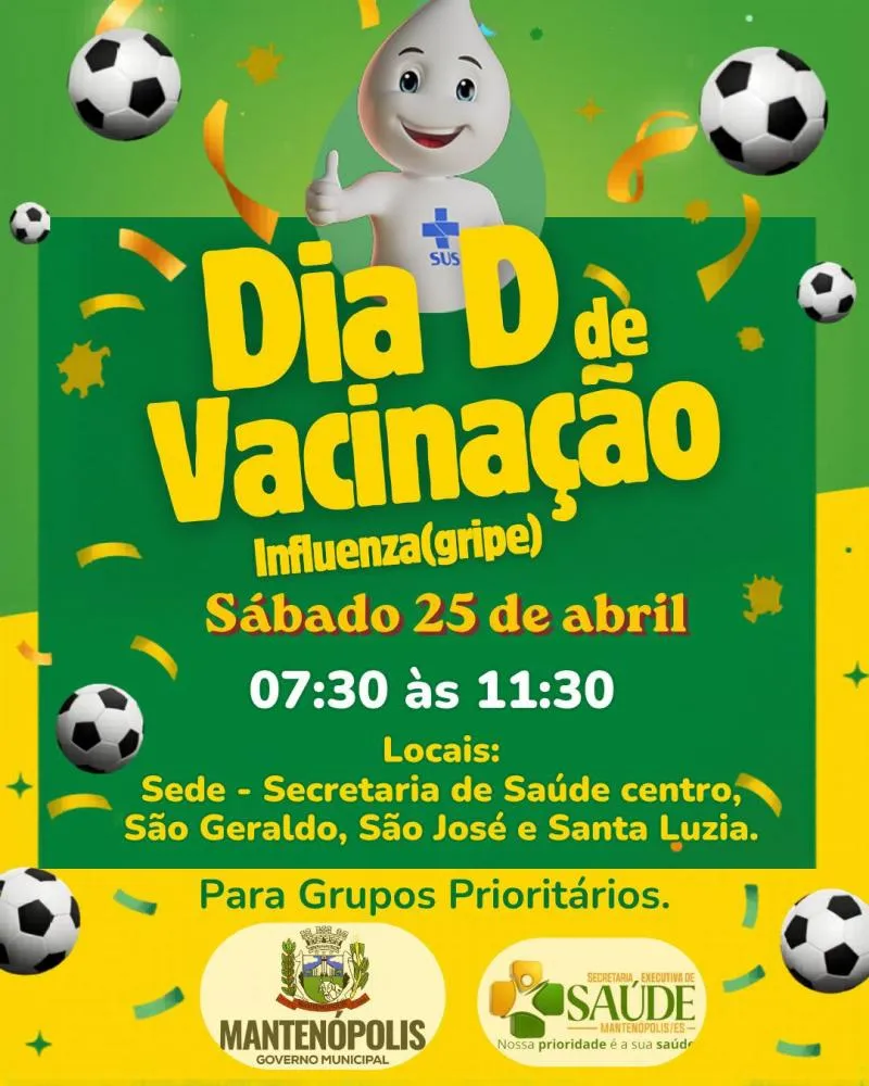 Com o objetivo de reforçar a barreira imunológica da população antes do período de maior circulação de vírus respiratórios, a Prefeitura de Mantenópolis, por meio da Secretaria Municipal de Saúde, promove no próximo sábado, 25 de abril, a campanha "Vacinou, é Gol!". A iniciativa utiliza o clima esportivo para convocar os cidadãos a serem os "craques" da prevenção na luta contra a influenza (gripe).
